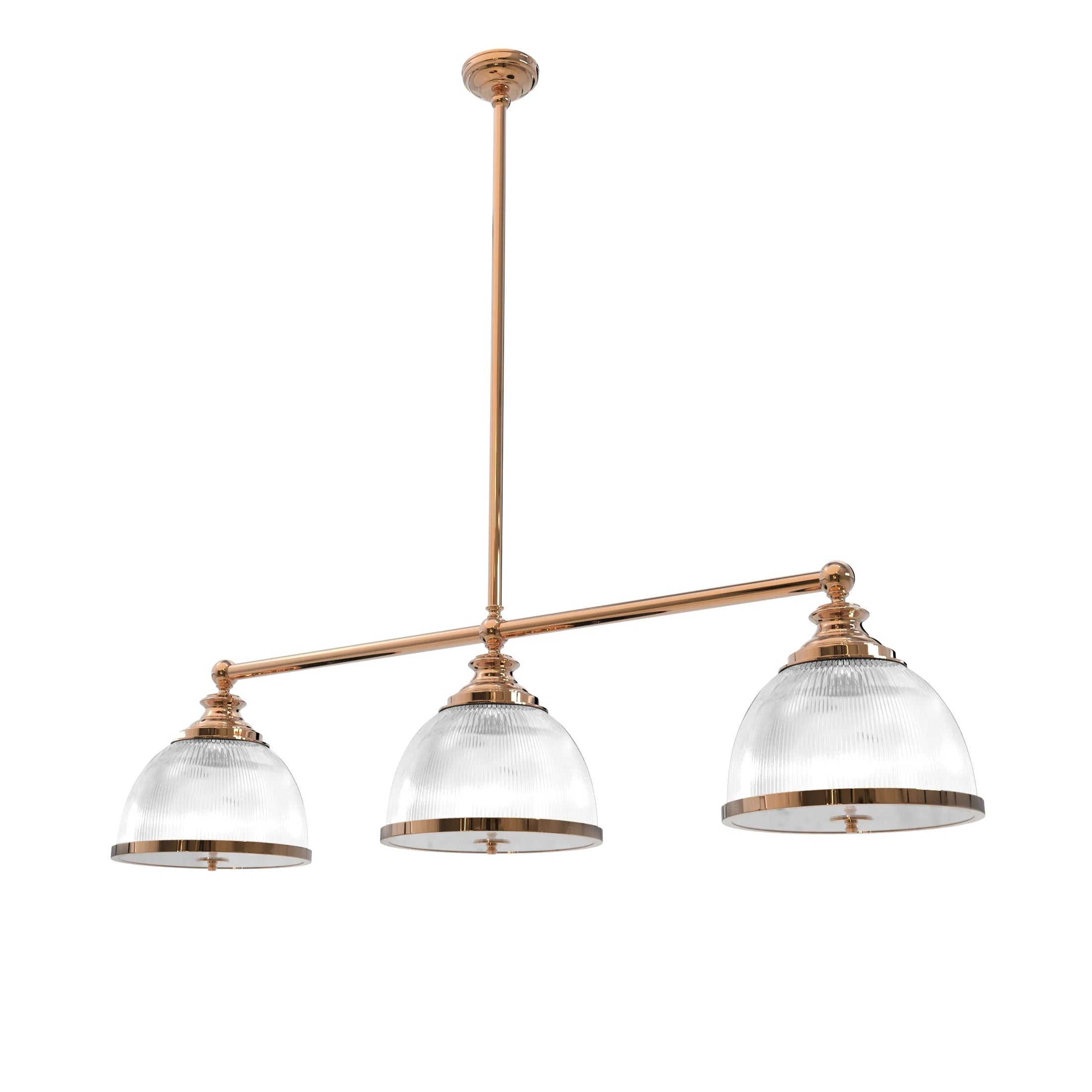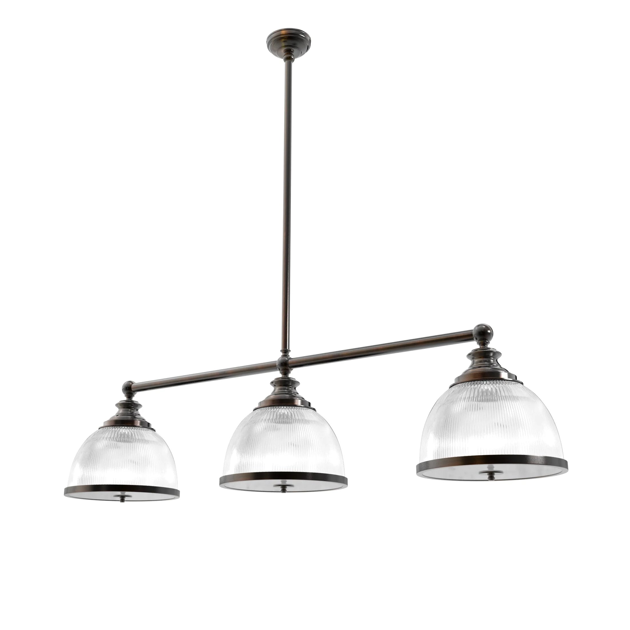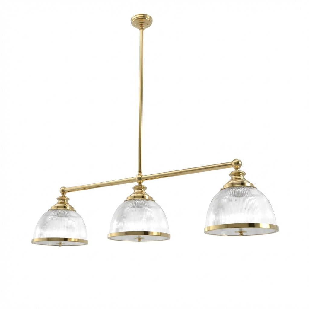 Step up your game under the sophisticated glow of the Triple Billiard with Rim Diffuser, where Ann-Morris' unparalleled craftsmanship meets the heart of competition. This traditional billiard-style light features a sleek horizontal crossbar that cradles three pristinely cut Holophane glass diffusers, delivering a spread of light as even and precise as your best shot. Available in a spectrum of Ann-Morris' signature finishes and sizes, this fixture not only lights your table but also enhances the room's overall allure. The vertical stem provides tailored height positioning, making it a customizable addition to your space that resonates with the legacy of luxury and finesse.