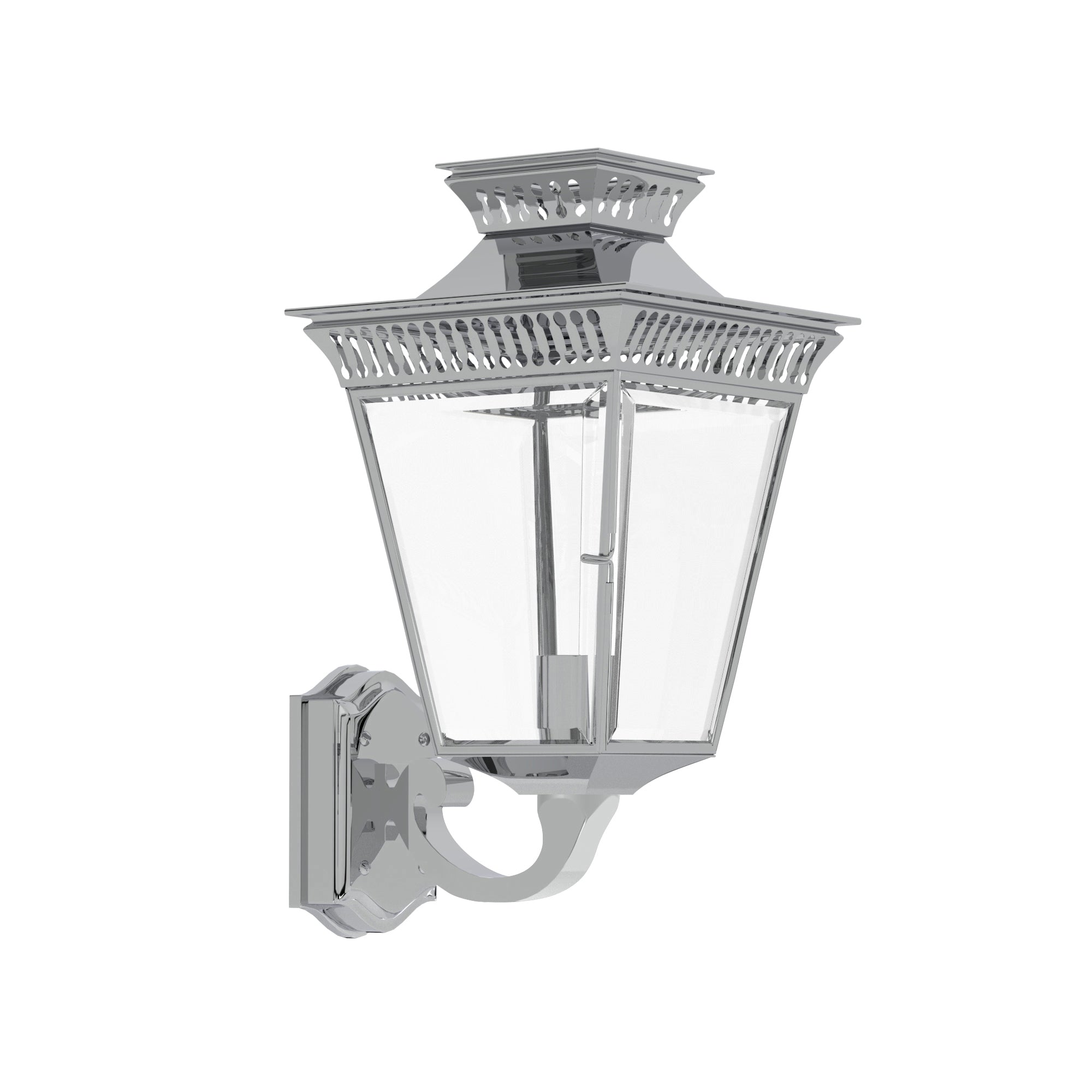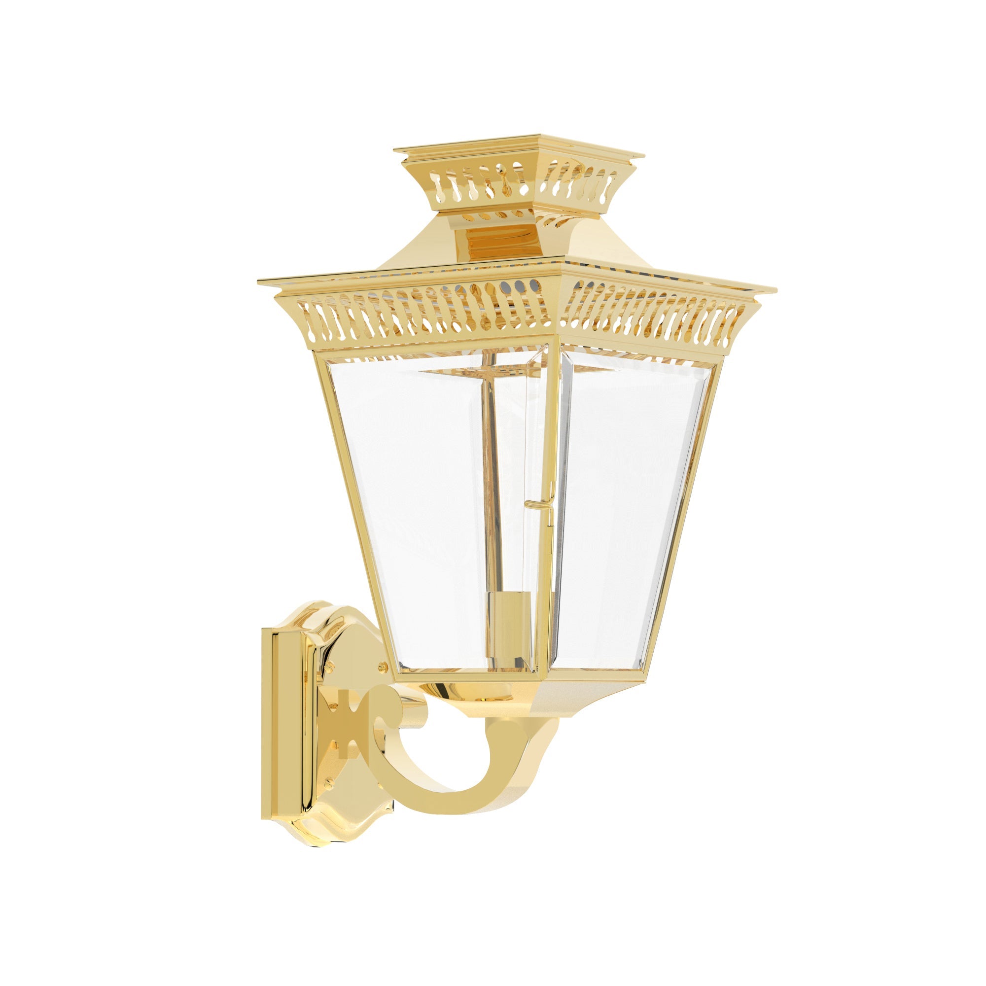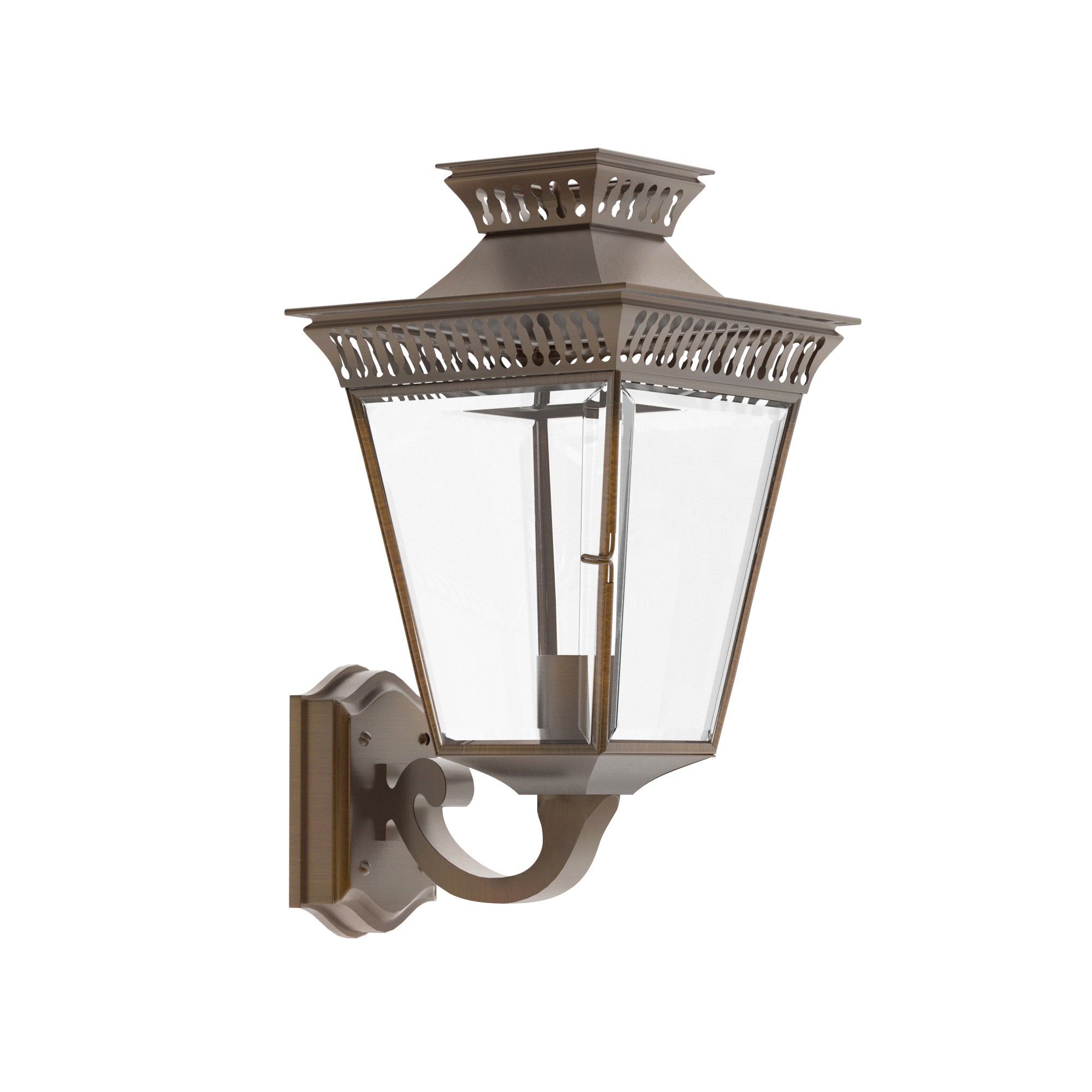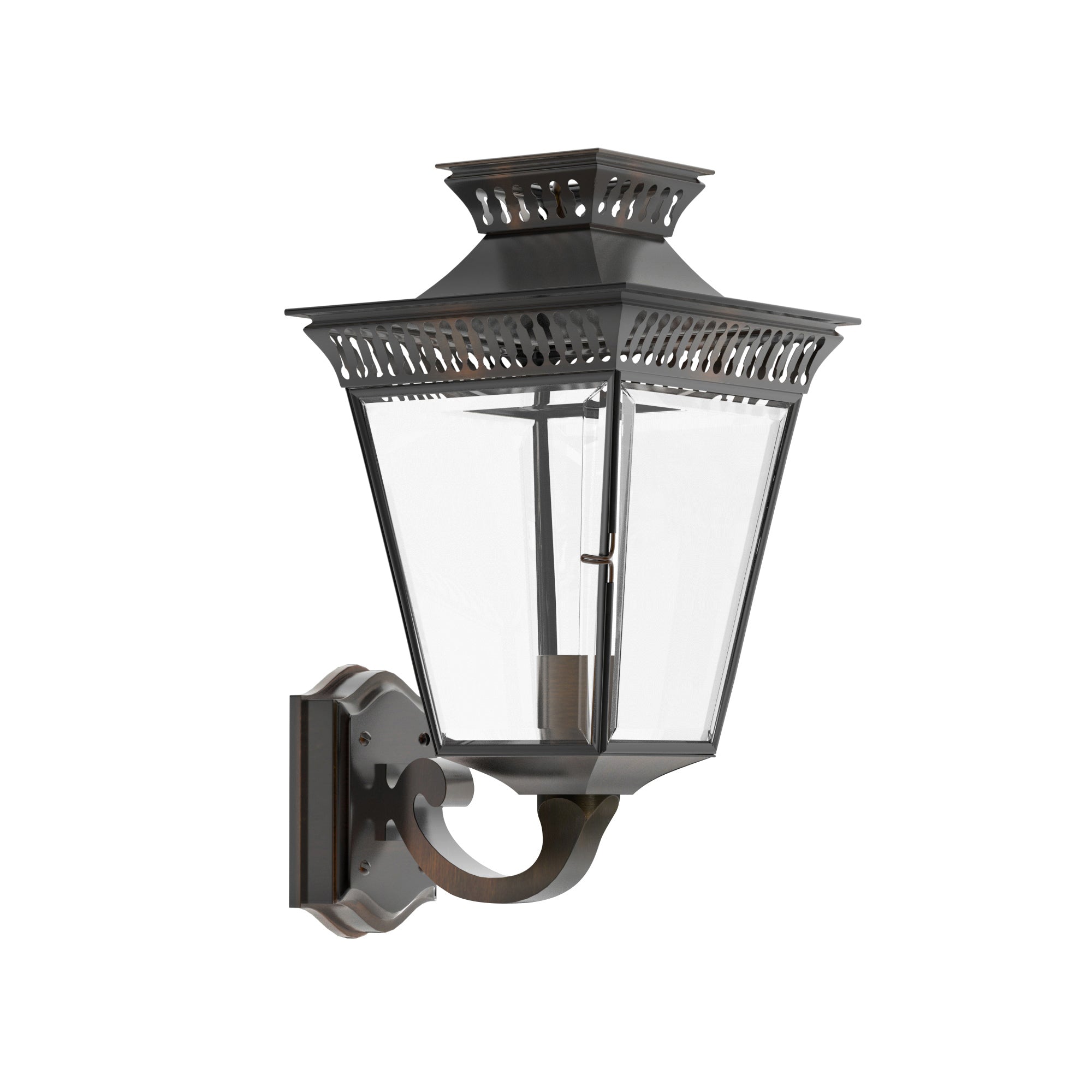 The Pagoda on Bracket is Ann-Morris' wall-mounted homage to the enchanting gas-lit streets of yesteryear. Retaining the classical allure of the Pagoda Light, this bracketed variant brings an old-world charm to any exterior or interior wall. Choose from the finest Ann-Morris metal finishes to suit your personal aesthetic, and let the warmth of this luminary welcome guests with its inviting glow. Perfectly proportioned to enhance an entryway or corridor, the Pagoda on Bracket is a stately addition to any traditional or contemporary home.