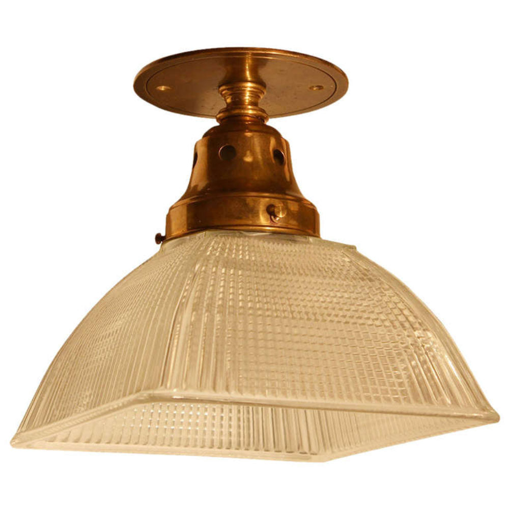 The Mid-Century Modern Holophane represents the epitome of 1970s lighting design, featuring a square Holophane glass that gently diffuses light to create a warm, welcoming atmosphere. The robust brass base adds a touch of sophistication, making this flush-mounted ceiling fixture a perfect blend of form and function. Ideal for those looking to infuse their interiors with the charm of vintage elegance.