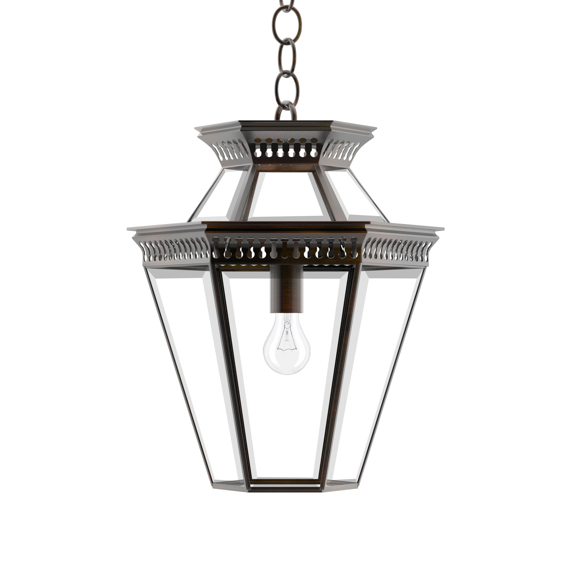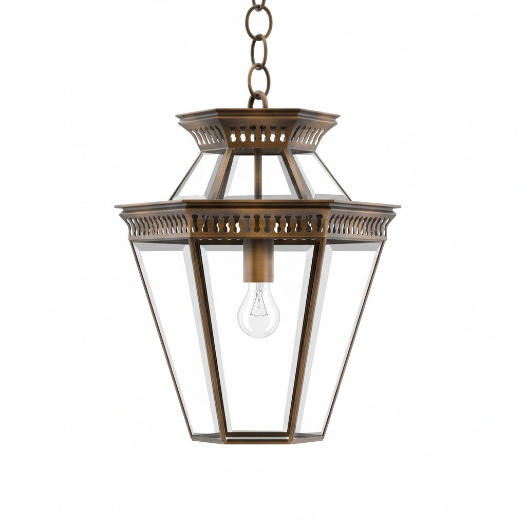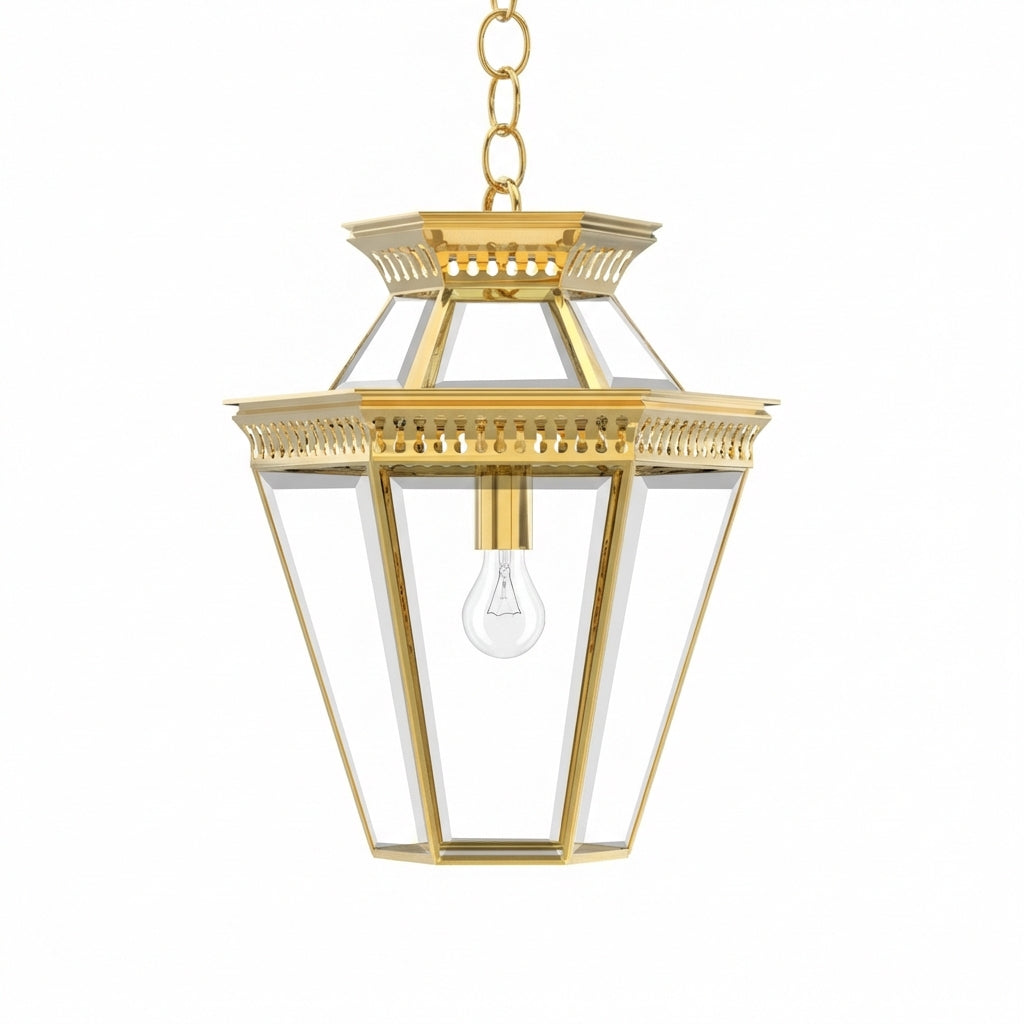 Step into the realm of geometric elegance with the Pagoda Polygon Light, a six-sided incarnation of the classic Pagoda series from Ann-Morris. Meticulously hand-finished in the complete range of Ann-Morris signature metal finishes, this lantern-style pendant is a marvel of design. Equipped with a matching chain or a bespoke stem option, it's a beacon of sophistication that casts a generous glow, ideal for welcoming guests in entryways or illuminating vast spaces with a singular, majestic light.